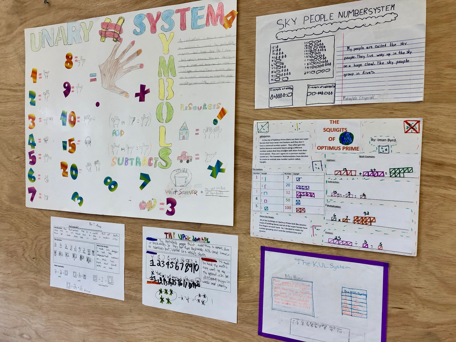 On the last day of the unit, we held a Number Convention where everyone courageously came together to present their number system on a poster. Students stretched their minds as they visited each poster by translating their own numbers to their classmates numbers, which is a unique way to practice flexibly switching between representations.